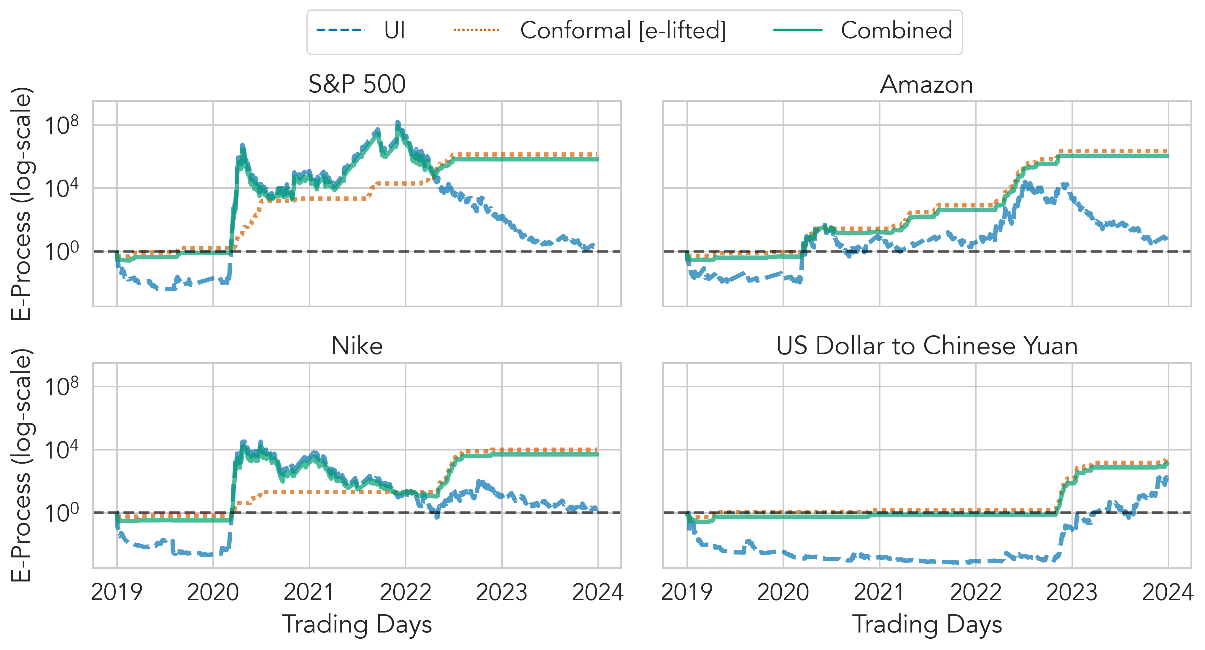 Figure: Combined E-Processes for Sequentially Testing the Randomness of High-Volatility Days in Financial Markets