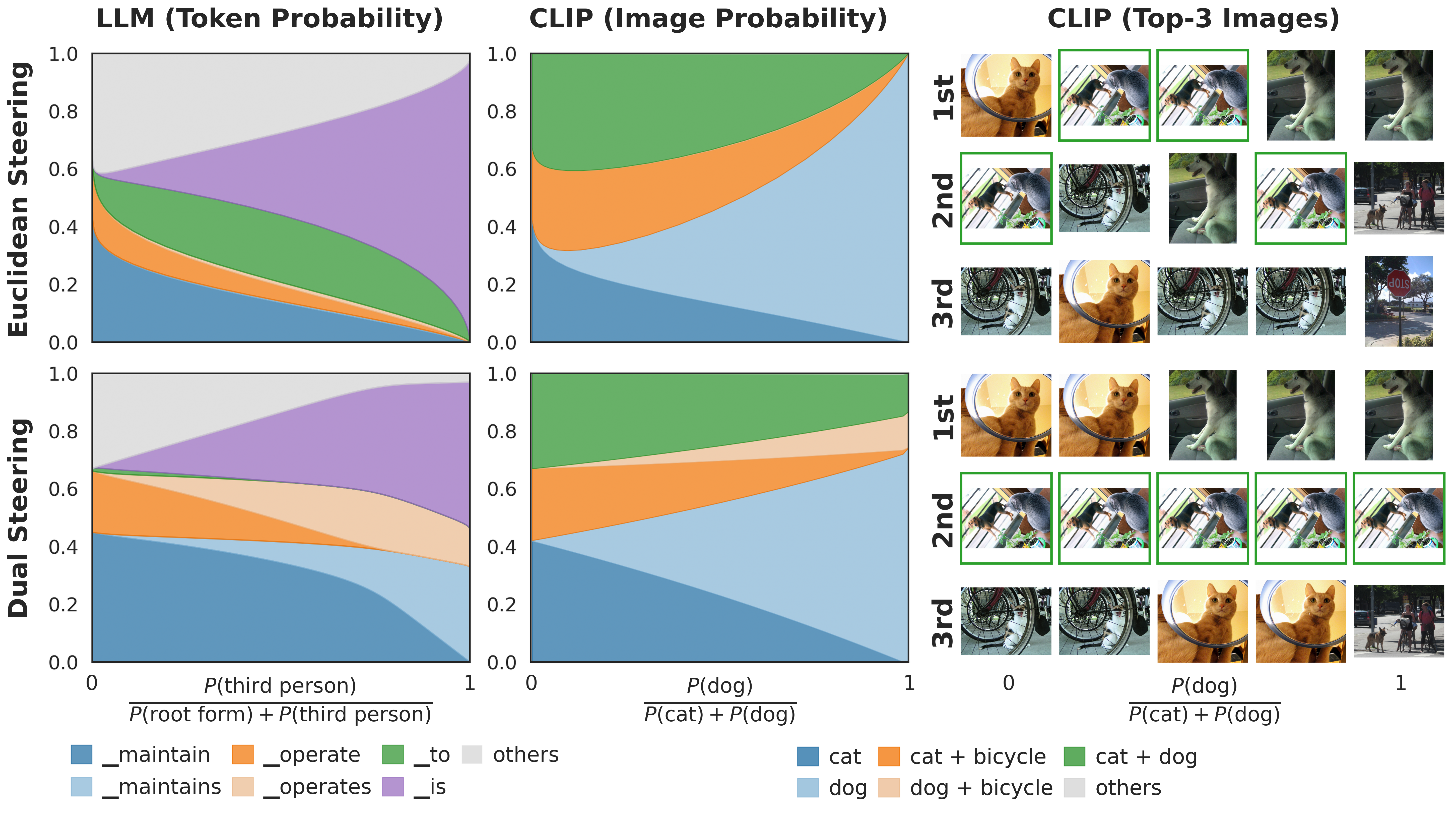 Figure: Euclidean vs. Dual Steering on Gemma & CLIP Models